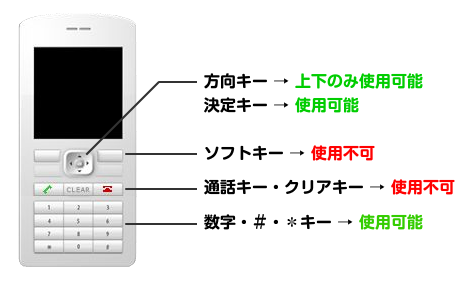 ・端末キーで使用できるのは、「上下」「決定」「数字(0~9,#,*)」のみ。